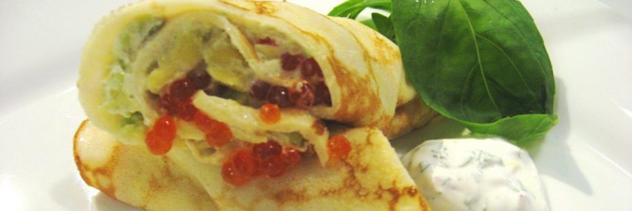 Змастити млинець авокадною сумішшю, зверху викласти ікру. Згорнути млинець щільним рулетом. Рулет розрізати на 2 частини, полити соусом.