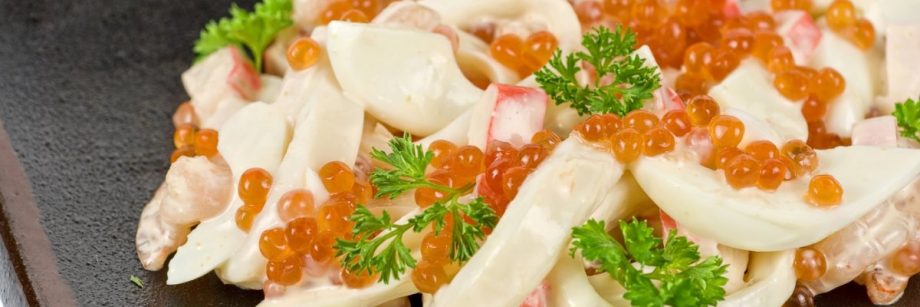 Boil the eggs, cool, separate the protein from the yolk, cut the protein. Yolk can be left for decoration. Then cook the shrimp in slightly salted water. Then we throw into boiling water, after cutting into slices, squids. The most important thing is not to digest them, otherwise they will turn out rubber! Cut the crab sticks.