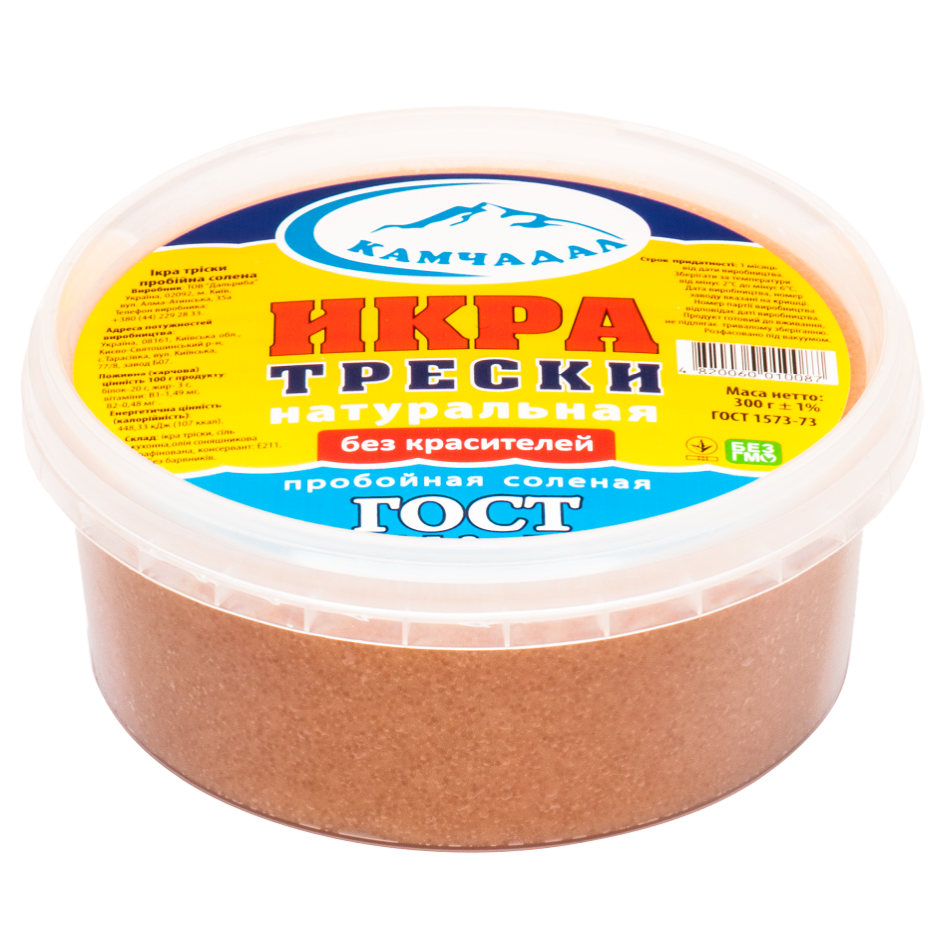 Iкра тріски – ще один подарунок для любителів ікри частикових видів риб. Це корисний, смачний і доступний продукт, який обов’язково стане улюбленою закускою на кожен день. У ній міститься унікальний комплекс вітамінів і мікроелементів, незамінних для здорового харчування. Консистенція ікри пастообразная, смак дуже ніжний. Ікра тріски ТМ «Камчадал» – традиційна, пробійної-солона, яка не містить підсилювачів смаку, емульгаторів і соусів. Упакована в пластикову баночку. Термін придатності – 75 діб від дати виробництва, вказаної на кришці баночки.