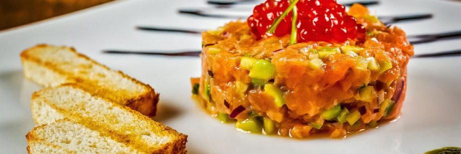 Філе лосося (без шкіри) посипати сумішшю солі, цукру, цедри одного лимона і кропу, -загорнути в плівку і відправити в холодильник. Через дві години практично слабозасолену рибу нарізати дрібними кубиками.