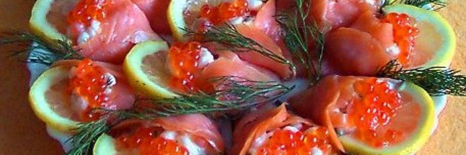 У мисці змішати всі, крім лососини. Додати сіль і перець. Згорнути лососину в конуси і начинити їх сумішшю. Подати зі скибочками лимона.